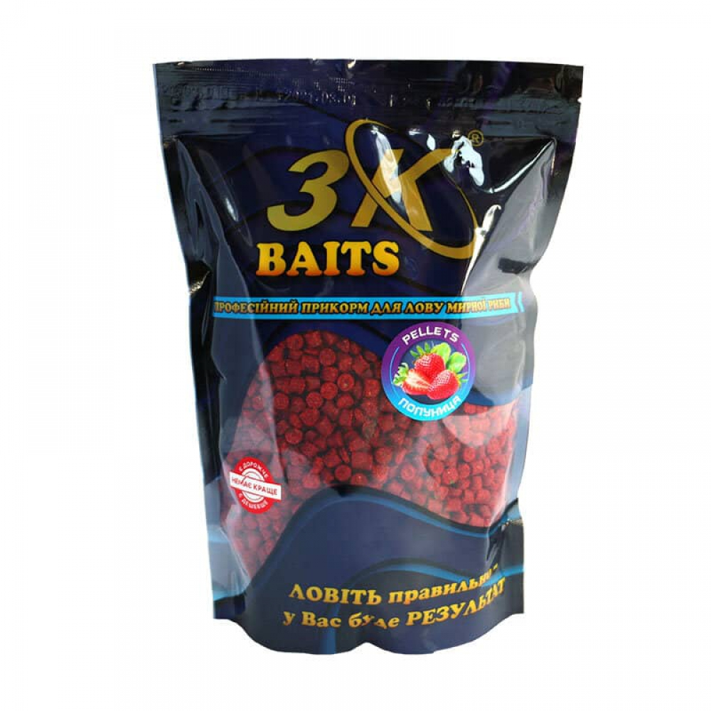 Pellets від ТМ "3KBAITS®" - це швидкорозчинні ефективні високопротеїнові гранули, насичені амінокислотами, що дозволяє приваблювати рибу за короткий проміжок часу і утримувати її на місці лову. Може використовуватися як самостійний прикорм, так і в комбінації з сухими сумішами. Завдяки більш ніж дворічним випробуванням на водоймах України, був підібраний оптимальний склад, завдяки чому пеллетс добре працює як в холодній, так і в теплій воді.
